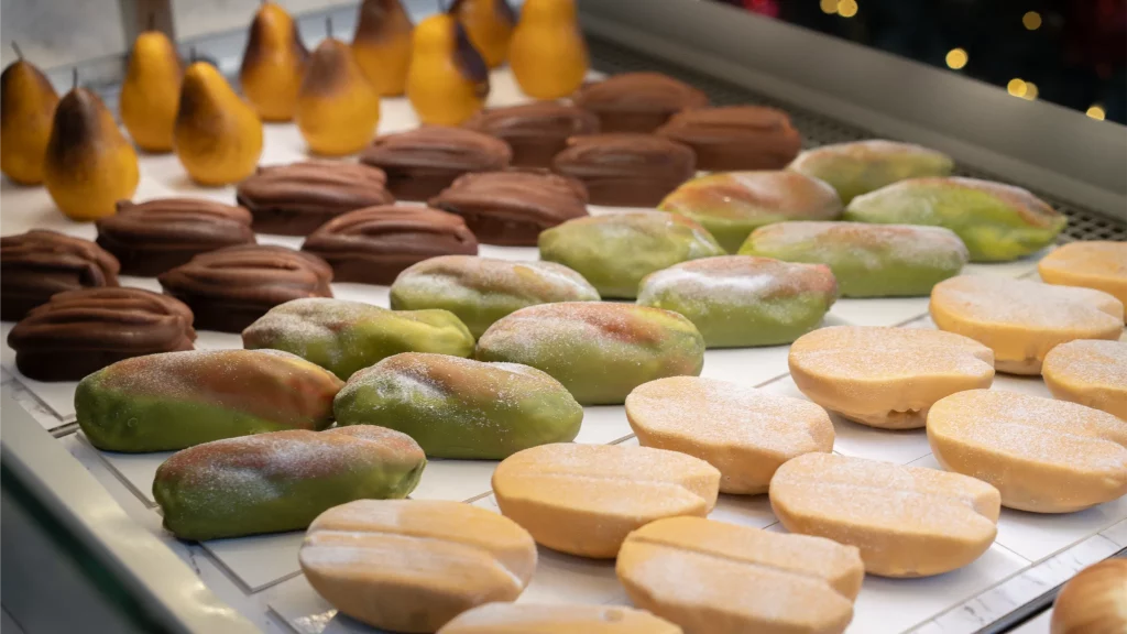Les desserts traditionnels laissent alors place à une gamme de fruits trompe-l’œil qui investissent la vitrine : poire, fraise, myrtille, mangue, mais aussi noisette, cacahuète ou popcorn, au gré des saisons.